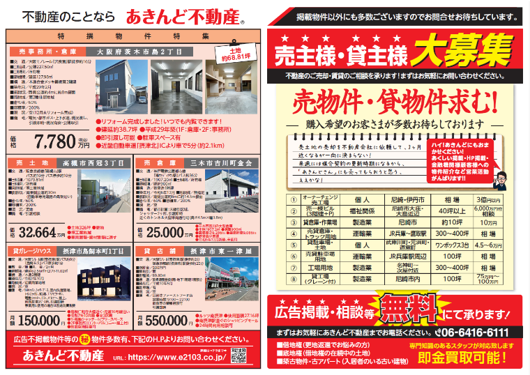 このほかもチラシに未掲載の物件を多数ご紹介可能です、不動産物件の事なら些細なご質問からご相談まで是非一度、あきんど不動産 06-6416-6111 までお問い合わせください!