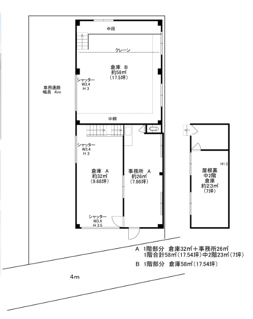 鉄骨造スレート葺1階建・倉庫A+B約27坪、事務所約8坪、屋根裏倉庫約7坪