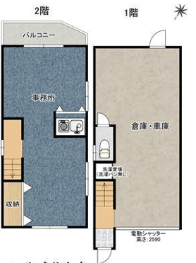 工業地域・1階倉庫・車庫・資材置場、2階事務所・電動シャッター