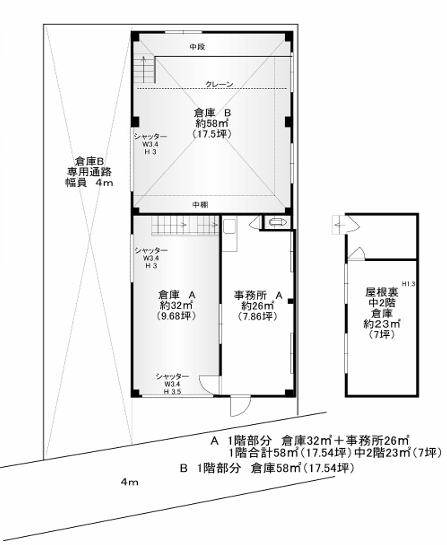 - 1階面積A1階約58㎡(17.54坪)・B1階約58㎡(17.54坪)