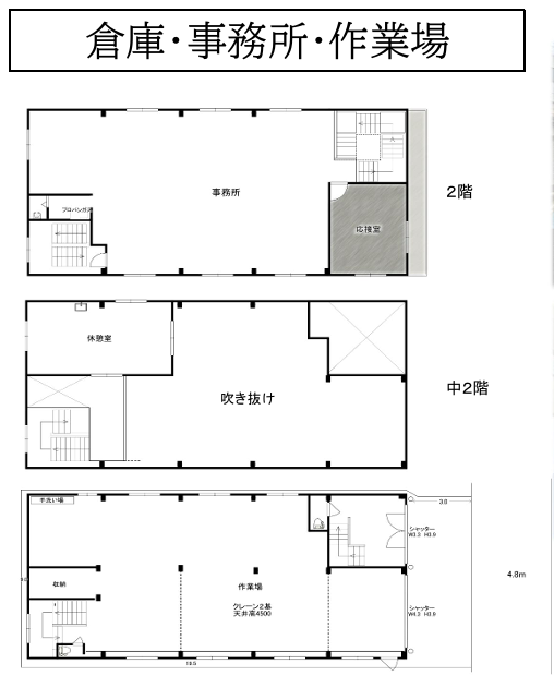 1階作業所53.08坪・中2階事務所15.12坪・2階事務所53.08坪・1階天井高4.5m